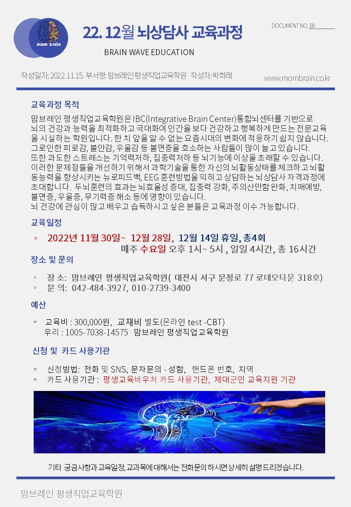 이러한 문제점들을 개선하기 위해서 과학기술을 통한 자신의 뇌활동상태를 체크하고 뇌활동능력을 향상시키는 뉴로피드백, EEG 훈련방법을 익히고 상담하는 뇌상담사 자격과정에 초대합니다.